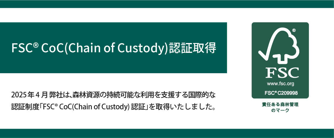 2025年4月 弊社は、森林資源の持続可能な利用を支援する国際的な認証制度「FSC® CoC(Chain of Custody)認証」を取得いたしました。