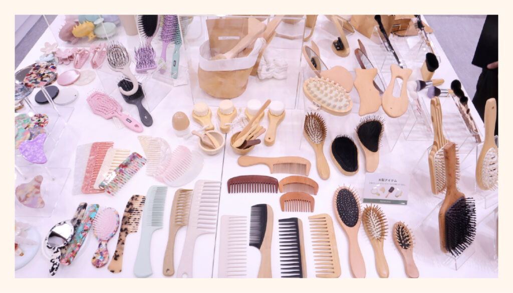 今年度もサステナブル化粧雑貨コーナーに力をいれ大変ご好評をいただきました!環境に優しい素材を使用した「アセテートミラー」や「アセテートコーム」は毎年人気があります。さらに、ナチュラルな風合いと高い実用性を兼ね備えた木製の「ヘアブラシ」や「ミラー」など、持続可能な素材を活用したアイテムを数多く展示しました。また、展示スペースには「環境に優しい素材がどれだけ従来の素材に比べて削減効果があるか」の情報を記載したPOPを設置し、具体的な数値やデータを通して商品の環境貢献度を分かりやすくし、多くのお客様に関心を持っていただきました。