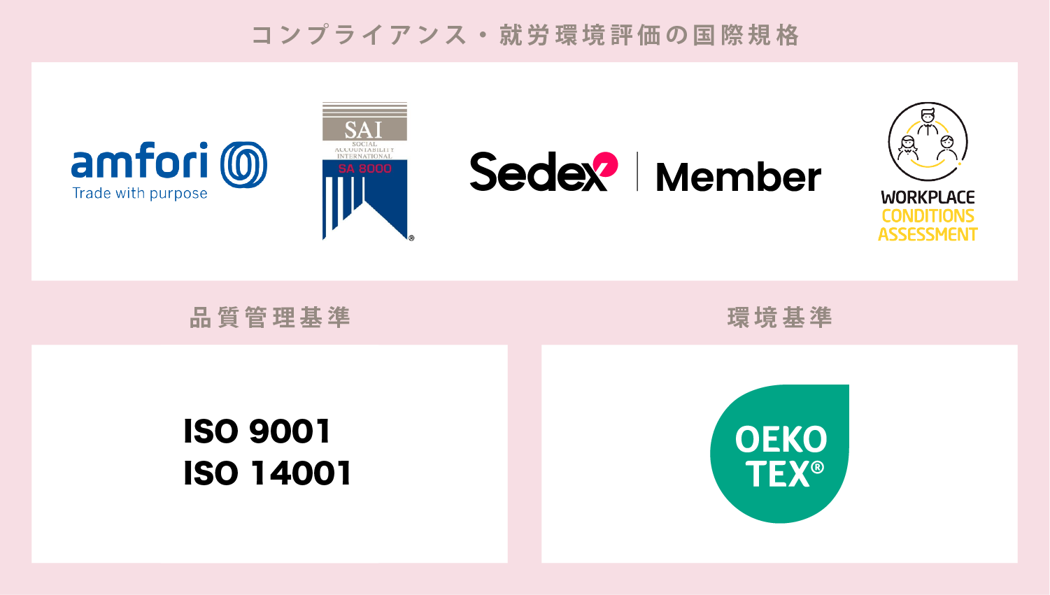 また同時にISO9001等の品質管理基準、エコテックスなどの環境基準などに